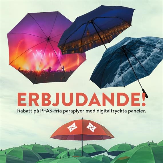Rabatt på PFAS-fria paraplyer med digitaltryckta paneler.