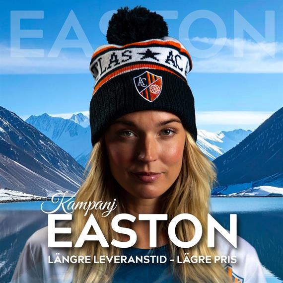 Populära Easton är en extra kraftigt dubbelstickad mössa i akryl, med ribbstickat uppvik med tofs. Specialdesign med stora möjligheter. Bättre miljöval - båtfrakt!